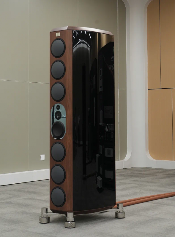 Enigma Veyron(威龙)系列把荷兰KHARMA的奢华演绎得淋漓尽致,这套系统采用其次旗舰的Enigma Veyron 2D进行演示,秉承着KHARMA一贯对箱体独特高要求的制作工艺,并改用超高密度的Bulletwood(子弹木板)材构建而成。由于选用了这等硬度十足的木料,一般加工基本徒劳,因此厂家特意采用5-axis CNC机床进行铣削切割加工,确保造型有着精确的表现。鉴于全新的Enigma Veyron 2D有着优雅流畅的线条和精细的工艺,因此在箱体加工方面非常小心和专注。单元方面,整个箱体上下采用哑铃式对称分布,正中位置由三只Diamond Concave黑钻石高音单元构成,最中间的一只是一英寸的Diamond Concave黑钻石高音,上下则分布了两只2英寸的钻石高音单元,这三只单元均是KHARMA向德国Accuton特别定制的产品。顶部和底部则为7英寸和11英寸的KHARMA Omega-F单元(F指没有存在涡电流),有着极高的速度以及控制性,背面的单元同样分布了11英寸KHARMA Omega-F无源辐射器,大大提升了极高速度以及扩散性。