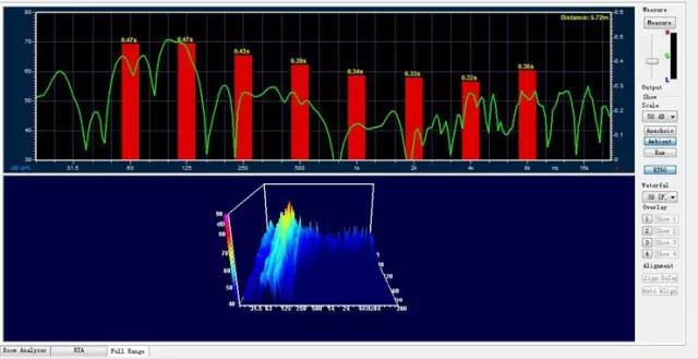 由於本房間當初考慮了盡量增大面積,因此非矩形,導致無法建模模擬,因此在低頻段存在2個駐波峰值,這可以根據實際聆聽效果來進行修正。而在實際試聽時,也缺失發現了低頻稍顯多,但好在空間關係,並不混濁,而且也滿足很多消費者喜歡低頻量感的需求。