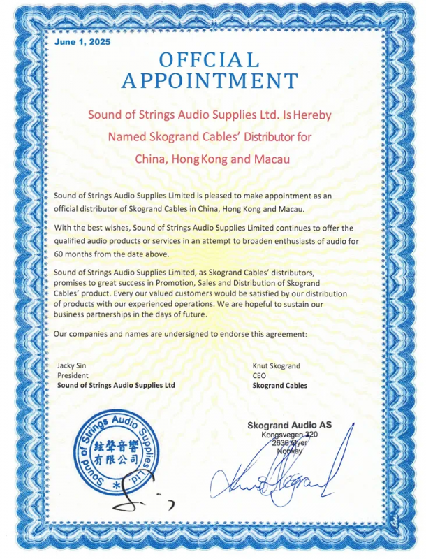 由即日起,絃声音响有限公司正式成为挪威Skogrand Cables高级发烧线材承架之中国(包括香港澳门)总代理,絃声音响响凭借多年对发烧音响的经验和坚持,致力为国际知名音响品牌代理,推广、供应及零售服务,为顾客提供可靠的服务与支持,更积极引进最好的产品。