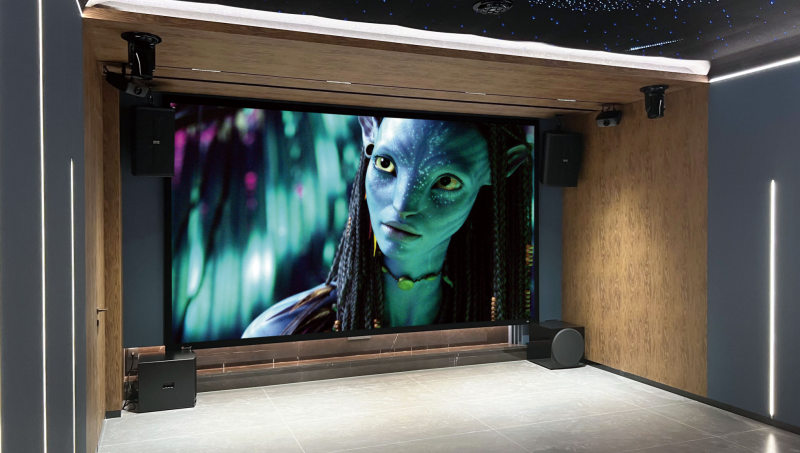 影院的投影仪选择的是Epson爱普生CH-TW7400家用4K HDR投影机,具备极高的画面分辨率与出色的色彩还原能力,完美呈现影院级视觉效果。投影画面通过180英寸微孔透声幕布呈现,其超大画幅与宽广视角为观影带来沉浸式体验。同时,透声设计让前方音箱得以隐藏于幕布之后,实现视觉与听觉的无缝融合,无需为音响布置妥协画面美学,是对空间美感与音效表现的双重优化。