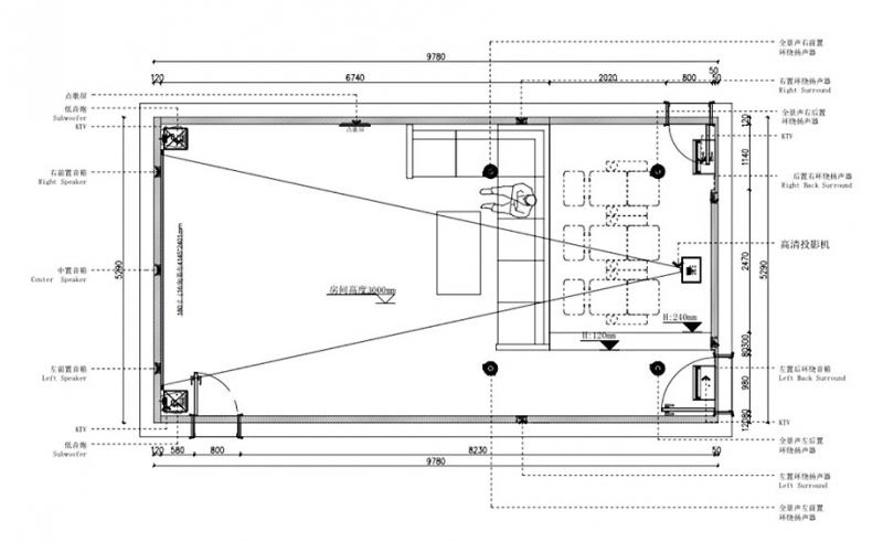 影院空间为约50平米的正方形独立房间,具备良好的结构基础。考虑到视听均衡及座位布局,伟地音响团队采用对称式音箱布置与中心视点规划,最大化杜比全景声系统的声场表现。前端设立180英寸微孔透声幕布,可实现音箱隐藏式安装,确保美观与声学性能兼顾。