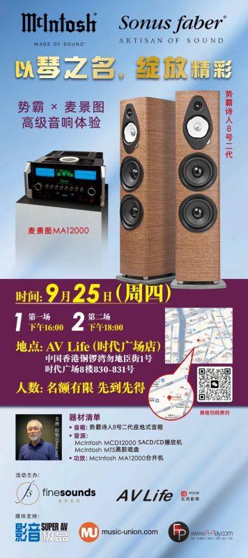 非常幸运,台风“桦加沙”远离香港,社会秩序恢复正常。今天,娓颂亚太与“AV Life生活影音”在中国香港AV Life时代广场店举办的两场“势霸×麦景图高级音响体验会”如期进行。本次活动以意大利Sonus faber势霸Sonetto VIII G2诗人二代8号座地式音箱,结合美国McIntosh麦景图多款高级音响产品,向香港本地烧友带来“以琴之名,绽放精彩”为主题的器材演示和音乐欣赏活动。
