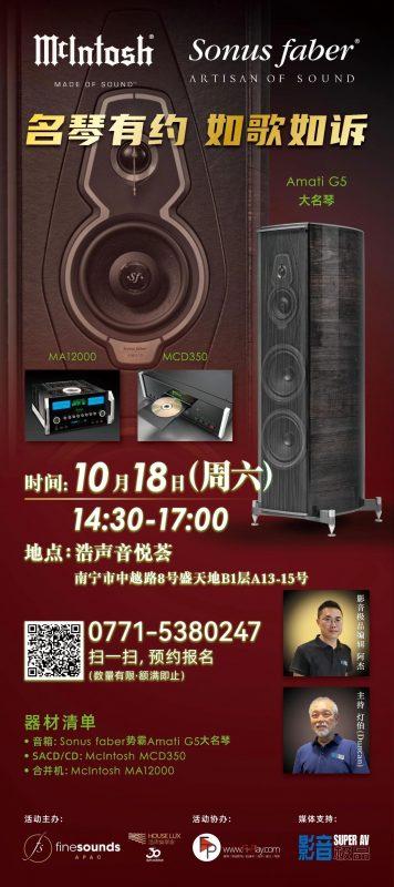 10月18日(周六),娓颂亚太和南宁浩声音悦荟将联合主办“名琴有约,如歌如诉——Sonus faber势霸Amati G5演示会”,本次活动由FiPlay协办,《影音极品》作为媒体支持。演示会将在南宁浩声音悦荟举行,现场结合全套美国McIntosh麦景图高端音响产品,展示Sonus faber势霸“大名琴”的魅力,有兴趣的朋友可长按识别下图二维码进行预约报名。