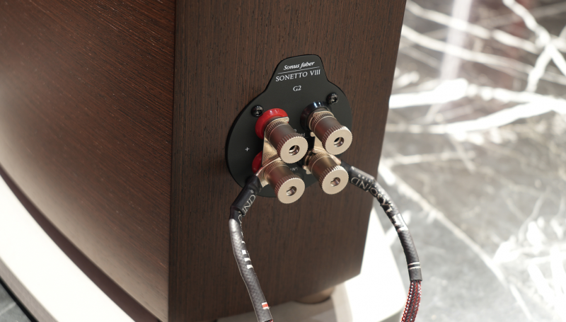 Sonetto VIII G2的低音反射在箱体底部,朝向下方的混凝土底座。混凝土底座不但可以增强稳定性,同时最大限度降低振动,也成为经典实木和皮革饰面的补充,为音箱增添了现代和工业美学的元素。混凝土底座配有橡胶脚垫以及可选的钉垫。音箱背面的双接线柱,满足双线分音和双功放的扩展使用需求。