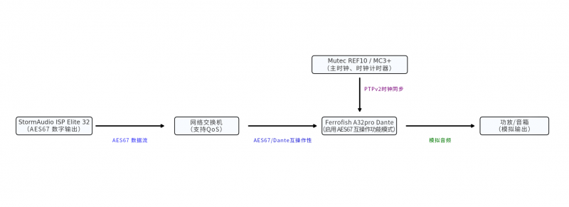 StormAudio其数字输出模块为 “Digital AoIP AES67 IN/OUT Upgrade”,意味着:它通过网络传输音频信号(AoIP = Audio over IP)。数字音频网络(AoIP)与AES67/Dante具有互操作性,可以理解为AES67是标准,Dante 是实现,AES67定义了跨厂商的AoIP流传输协议(采样率、封包格式、时钟同步方式等),Dante是一个支持AES67流的商业协议。StormAudio输出 AES67 数字音频流,Ferrofish A32pro接收AES67流(通过Dante兼容)并转为模拟输出。