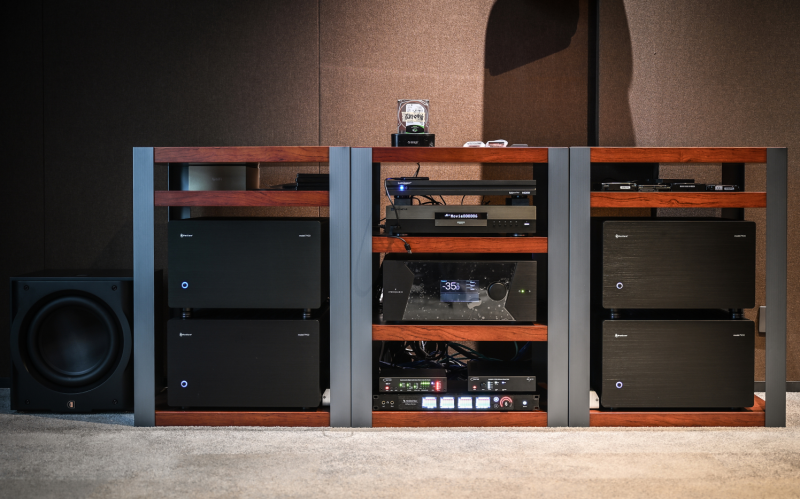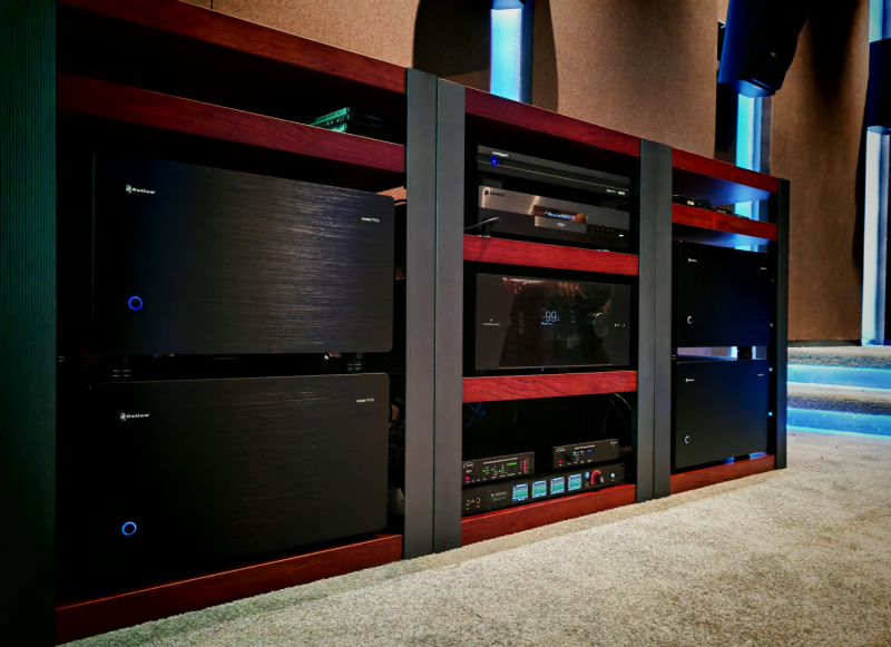 维度全景声展厅使用的美国Outlaw 7900是现存为数不多的大功率AB类七通道后级放大器,每台重达66公斤,其所有通道在20Hz‒20kHz全频带同时驱动条件下,4Ω负载能够输出7X550瓦的持续强悍功率,不仅具备纯粹暴力的动态输出,更具有细腻音质和控制力并存的高级表现。其次,这款放大器的总谐波失真在20 Hz – 20 kHz全频带小于0.05%,1 kHz 时⼩于0.005%,所以即使在高功率输出的状态下,音频信号也几乎没有任何失真,这保证了声音的精准还原与细节展现。信噪比大于120 dB,远超许多同类产品,意味着在极低信号输出的状态下,系统也能保持极低的噪声,确保影院中每一段音频的清晰度与纯净度。Outlaw 7900阻尼系数大于400(10Hz-400Hz),这项指标对于低频控制至关重要,它保证了低频输出的精准度和紧凑性,避免了低频的“松散”或“模糊”,让每一次低频回放都沉稳扎实。