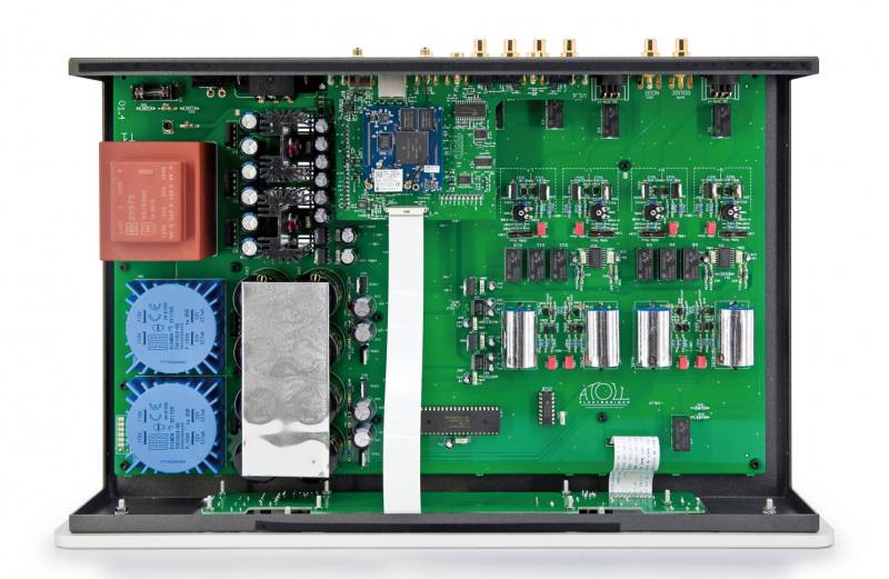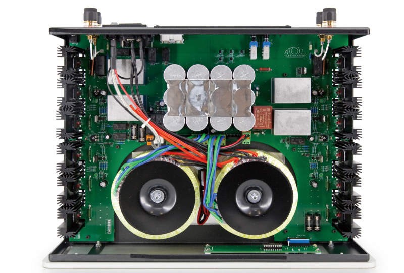和ST300 Signature搭配的AM300功率放大器同样来头不小,它的输出功率为150W/声道(8Ω),还可桥接成单声道,这时输出功率为500W(8Ω)。再次强调ATOLL放大器的功率数值一向标得偏低,这是由于偏置电流调得偏大的缘故,实际上以AM300这样的电源配置和功率管数量,换作其它品牌早已上了250W/声道(8Ω)。AM300为双单声道结构,每声道使用3对场效应管,各由一只440VA环型变压器供电。在滤波部分可见12只ATOLL订制的“日本化工”黑金刚电容,每只电容量为6800µF,上面贴有消除振动的箔片,AM300总电容量为83300µF。每个声道还有两个神秘的方型带金属壳屏蔽的盒子,里面封装了发烧电容等调音元件,由ATOLL向德国Mundorf定制。