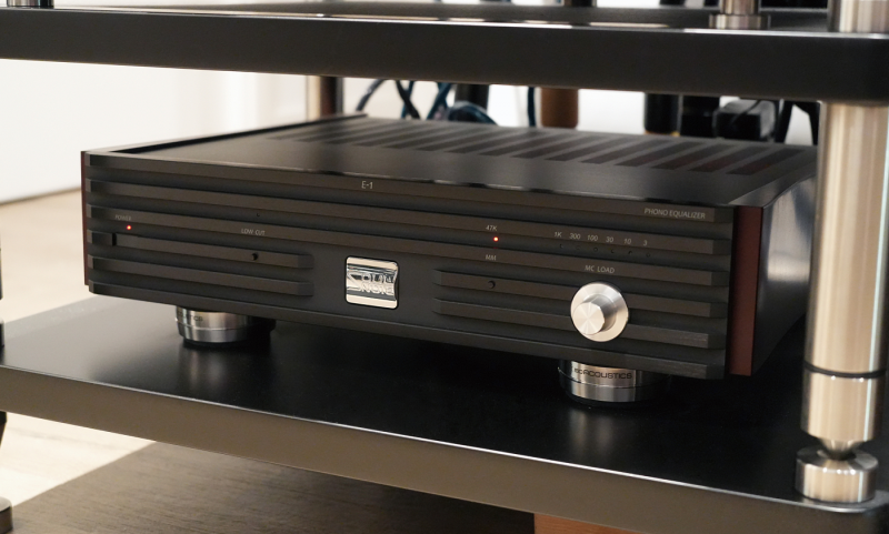 Soul Note E-1是品牌在2016年(10周年)而推出的產品,也是廠方蓄力10年後推出的精品,儘管是品牌的入門級產品,但用料和設計都絕不妥協。E-1採用全平衡無負反饋線路設計,支持MC及MM唱頭。整機按鍵均在前面板中,前方分別有電源開關、LOW CUT FILTER、MM/MC選擇和MC的阻抗匹配(提供3Ω、10Ω、30Ω、300Ω、1KΩ等負載可供選擇),背面除了常規的RCA外,還可以選擇XLR平衡端子輸出。E-1機身兩側更配合以櫻桃木飾板,令產品外觀更具日系中古機型的傳統感覺。E-1沿襲Soul Note的三腳釘設計,能實現出色的導震特點。